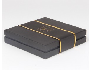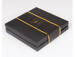 此款天地蓋帶圍邊禮品盒,選用黑卡紙裱1000g灰板,商標(biāo)燙金。禮品盒采用經(jīng)典的黑色作為整體色,搭配金色的LOGO,體現(xiàn)出簡(jiǎn)約、整潔的設(shè)計(jì)理念。禮品紙盒黑色主體色調(diào)將金色Logo顯得十分顯眼,極具層次感。