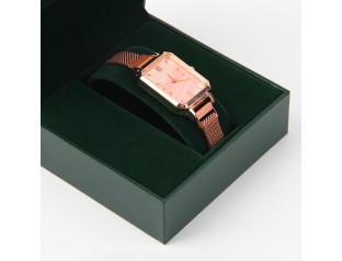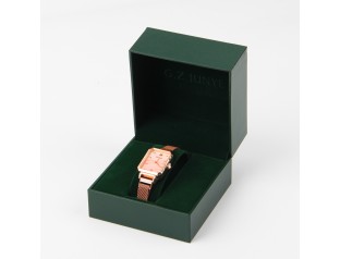 此款手表包裝盒采用了PU皮包膠胚,內(nèi)置白色EVA內(nèi)托,可用于手鏈或手表的包裝手表盒設計整體采用了紅色作為盒子主打色,可以很好的吸引消費者的注意。手表盒四邊金黃色的線條邊沿與紅色搭配給人一種很強的視覺沖擊感,華麗而不沉悶。