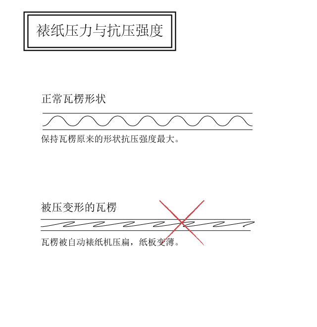 有的客戶希望不希望盒子的切面看見(jiàn)瓦楞,也有工廠裱紙師傅為了防止裱合不良,過(guò)分加大壓床的壓力、或者膠水輥的壓力,導(dǎo)致瓦楞被壓變形,犧牲了瓦楞紙盒的抗壓強(qiáng)度,對(duì)此包裝印刷廠家在裱紙的環(huán)節(jié)應(yīng)該提醒工人不要過(guò)度用力按壓瓦楞。