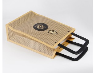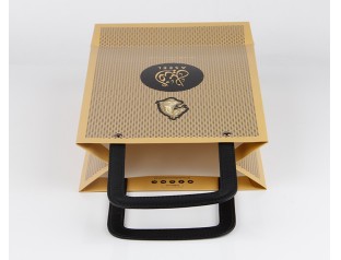 此款紙袋制作采用特種紙,商標(biāo)燙金,加上PU皮手提繩。手提袋設(shè)計(jì)的手提處選用了黑色PU皮,高檔紙袋手提繩打雞眼,提高了手提紙袋的承受力。廣州駿業(yè)紙袋廠家,專業(yè)16年印刷包裝行業(yè),免費(fèi)設(shè)計(jì),量身定制,想了解更多手提紙袋,歡迎致電:020-66677799