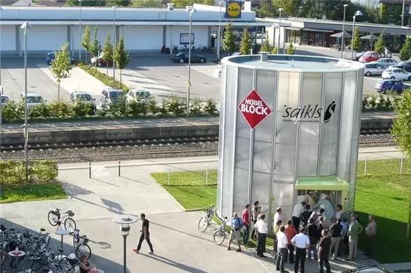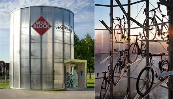 如果你覺得這樣的停車場過于“變態(tài)”,只有日本人才能想出來,那么再來看看其他國家的吧。Biketower也是一個自動化自行車停車系統(tǒng),占地只有30平方米,位于德國梅肯博伊倫火車站外,可存放112輛自行車,且利用太陽能作為動力能源。