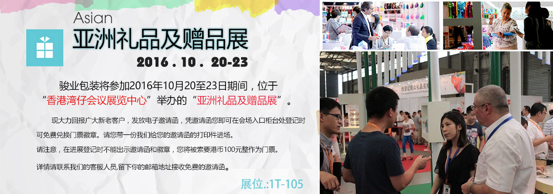 亞太區(qū)內(nèi)其中一項舉足輕重的超大型貿(mào)易展會-亞洲禮品及贈品展將于2016年10月20至23日香港灣仔國際會議展覽中心隆重舉行,屆時廣州駿業(yè)包裝盒制作廠家將盛裝亮相。
