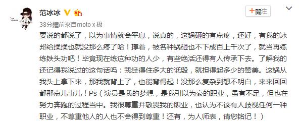 范冰冰在微博發(fā)文回應(yīng)此事,霸氣重申“我經(jīng)得住多大的詆毀,就擔(dān)得起多少的贊美”“這鍋我背得起”,并表示不該歧視任何一種職業(yè),隔空怒嗆該教授:“為人師表,請(qǐng)您銘記!”