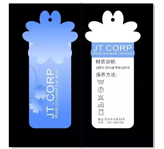 設(shè)計(jì)服裝吊牌的第十步:添加文字 在服裝吊牌上標(biāo)注:產(chǎn)品名稱、成分含量、洗滌方法,廠名廠址、產(chǎn)品安全技術(shù)類別等必要元素內(nèi)容。